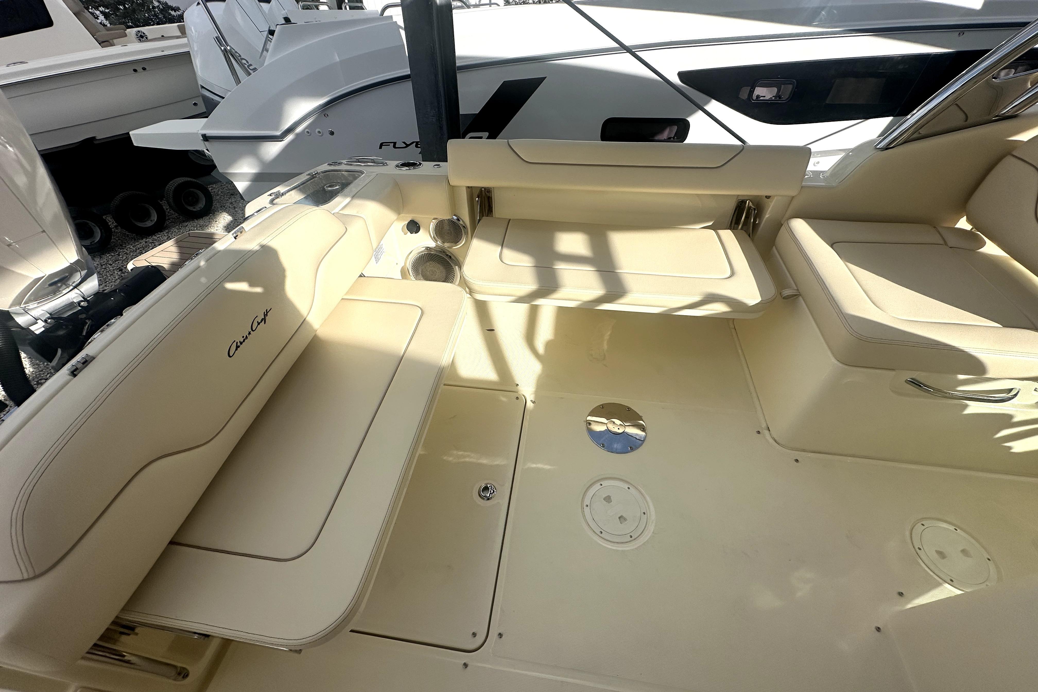 The Calypso 28 offers ample space and all the essential amenities for hosting memorable excursions. For easy access to the dock and the water, a starboard side-boarding door and extended swim platform are both standard. Select the Heritage Edition to enjoy teak accents throughout, including the covering boards, the swim platform, and a full teak floor.