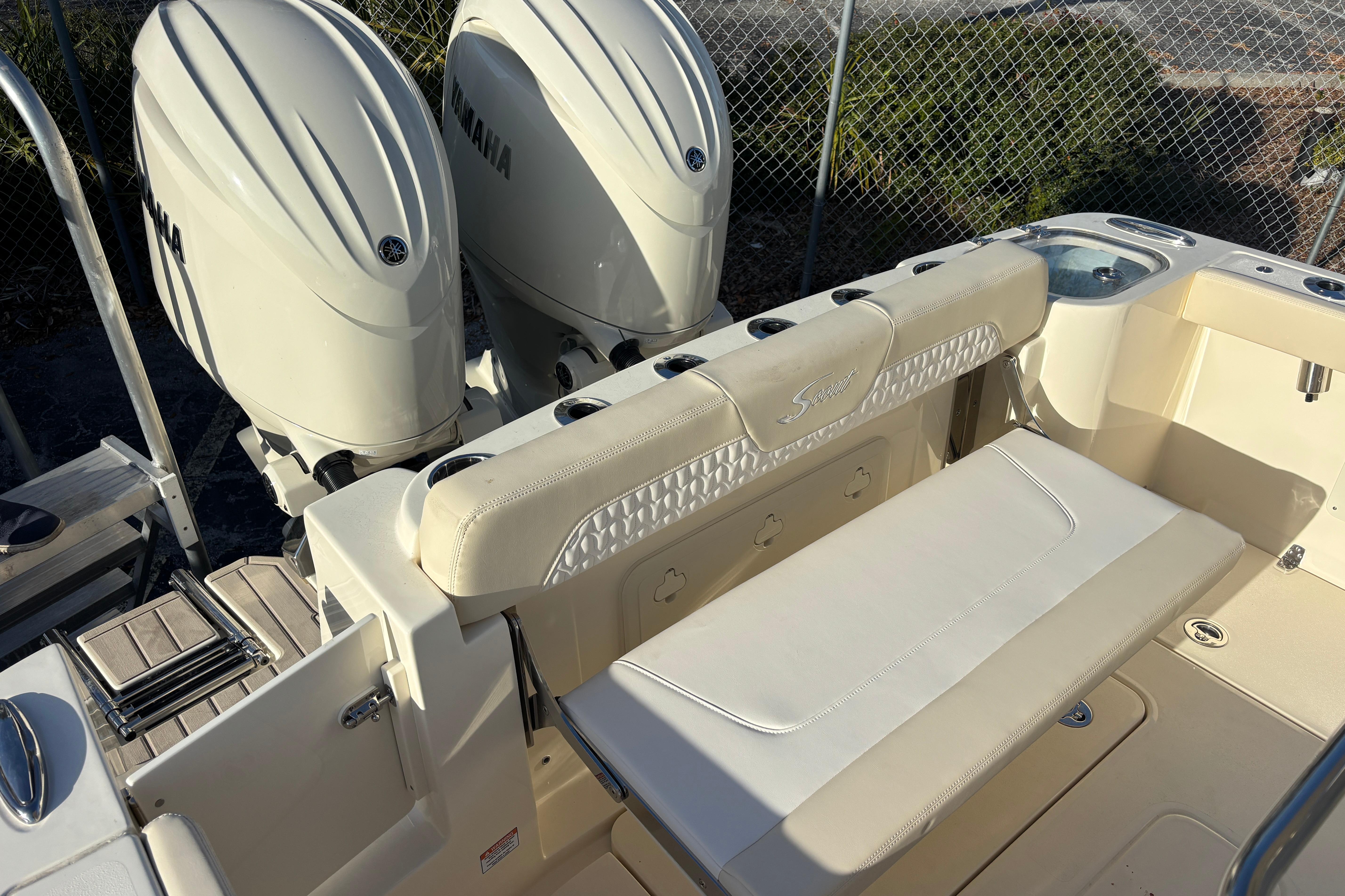- Fiberglass Leaning Post w/ Bait Prep, Station, Sink, Tackle Drawers, & Helm Seats w/ Folding Bolsters & Armrests