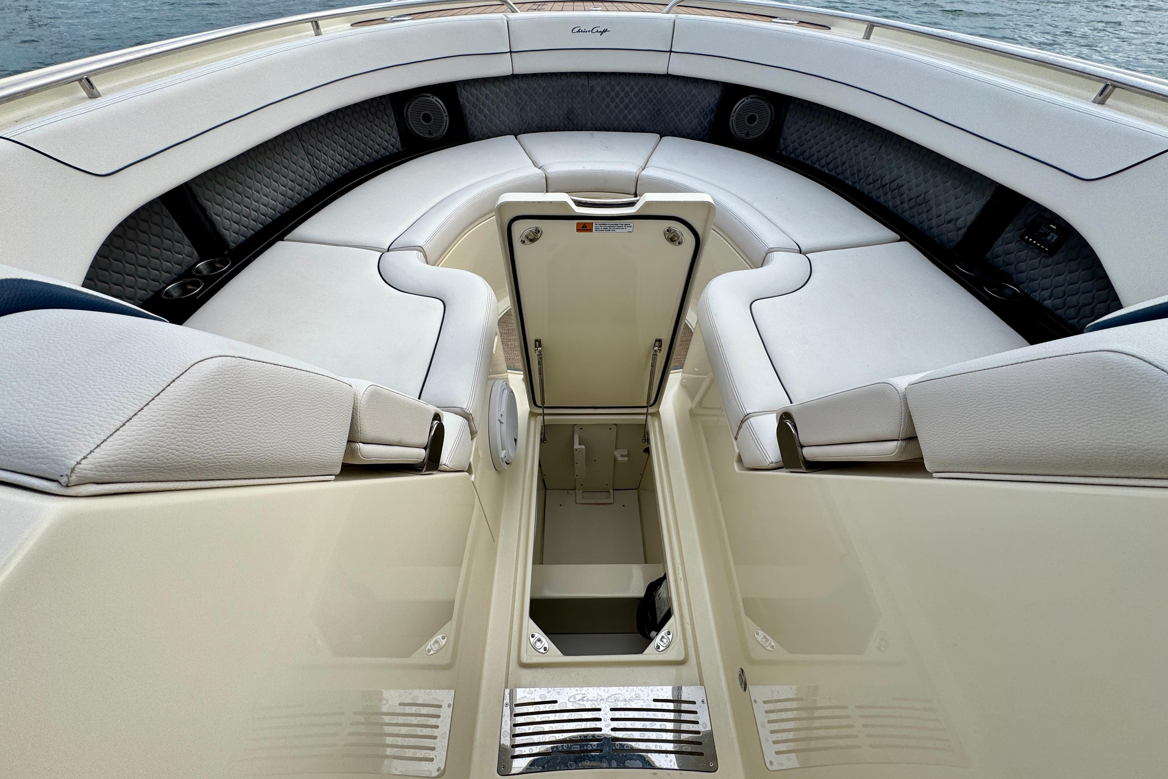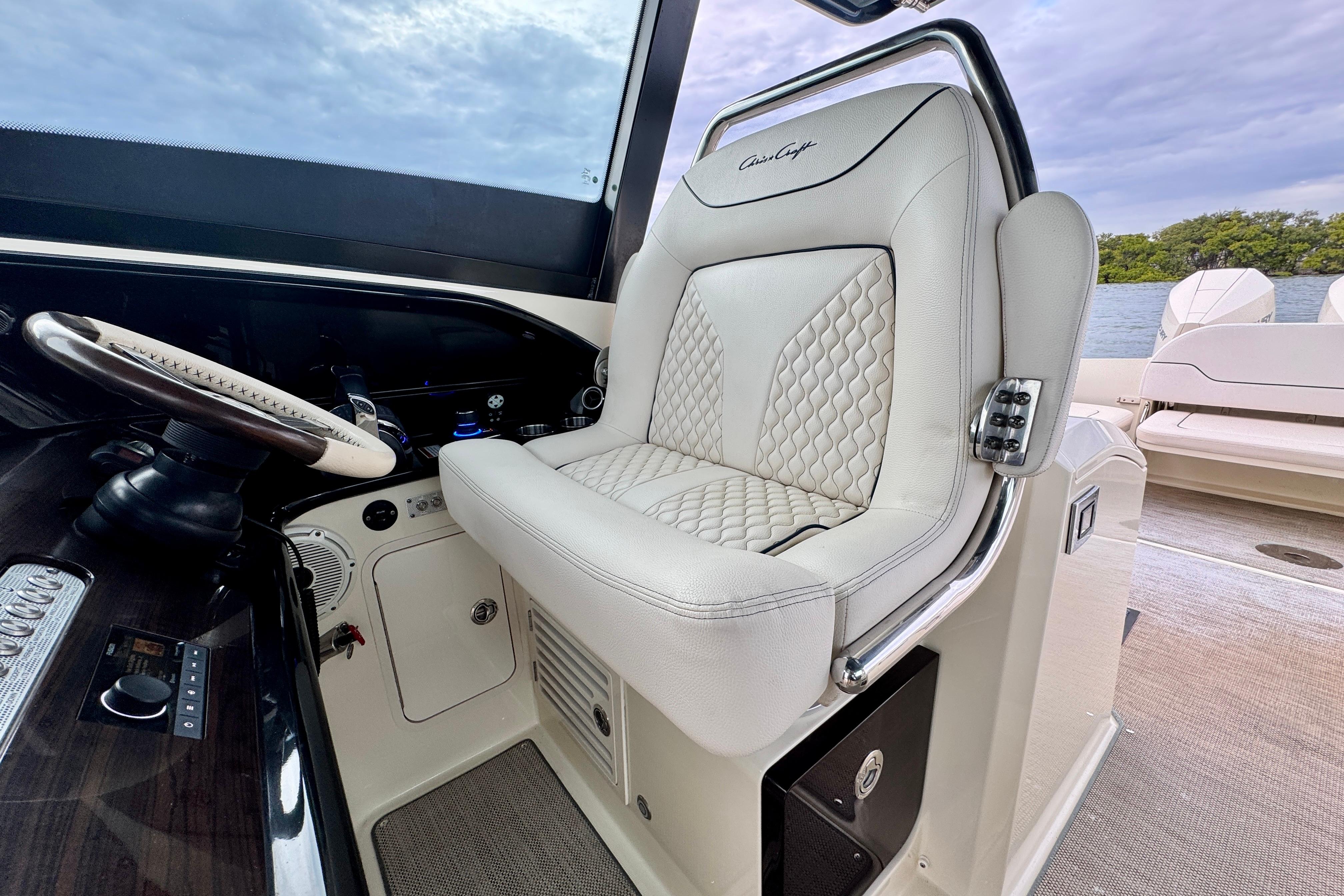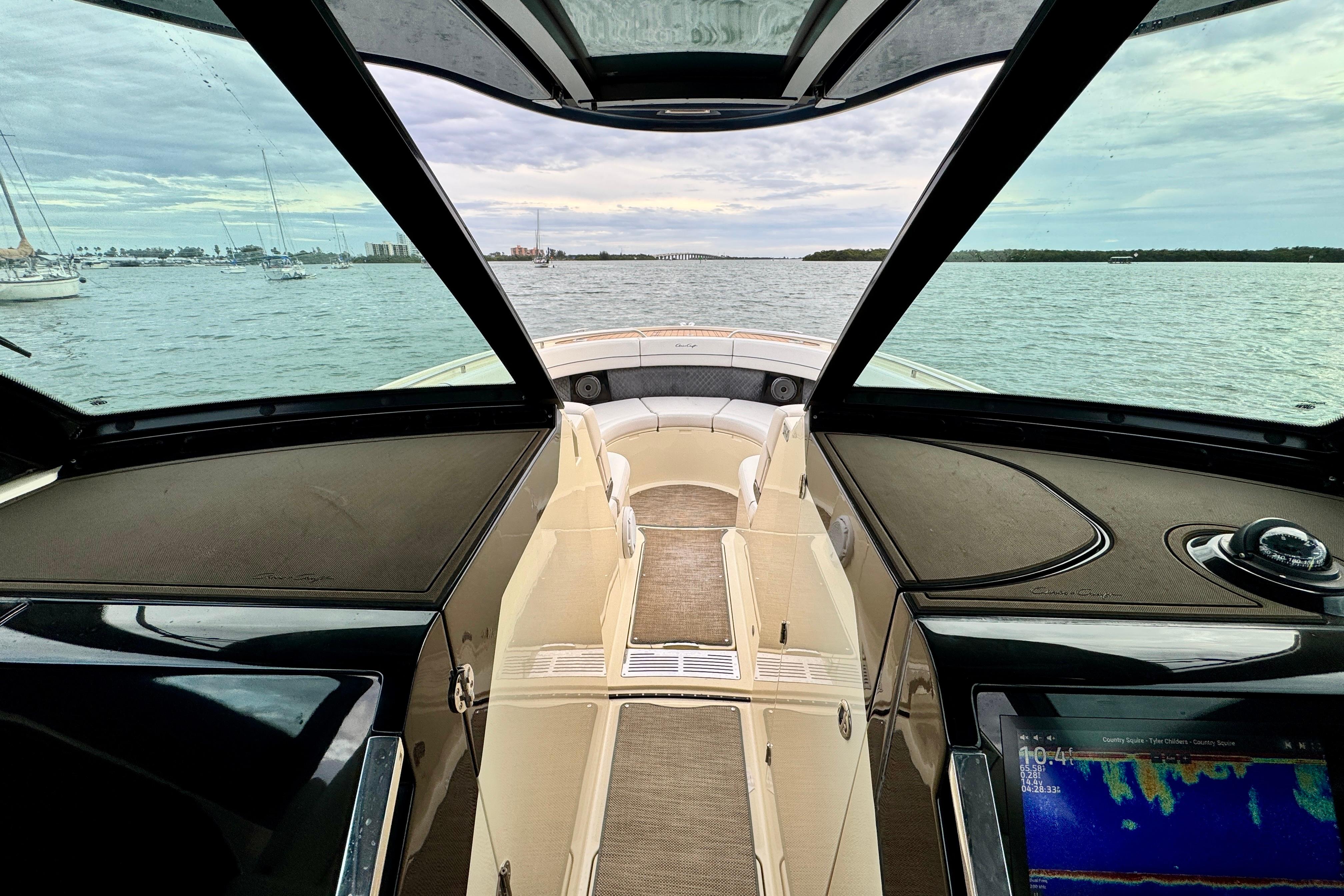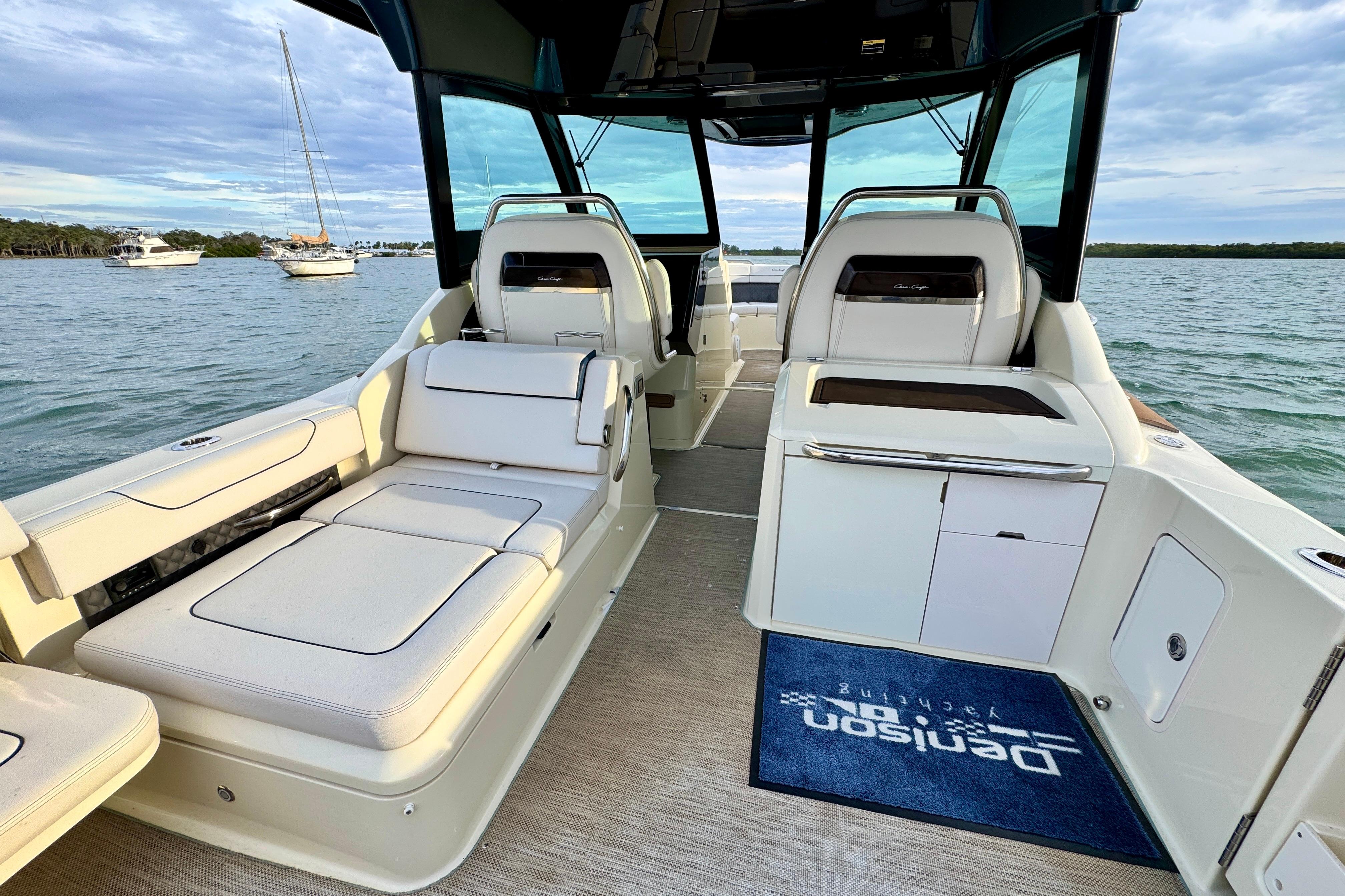 The Calypso 35 debuts our fully enclosed windshield with a power actuated center walk-through and sliding wind door. When the windshield opens, it encloses into the hard top, creating unobstructed views through both driver and passenger sides. With an optional helm air conditioning and heat system, the Calypso 35 offers maximum comfort for a great day on the water.