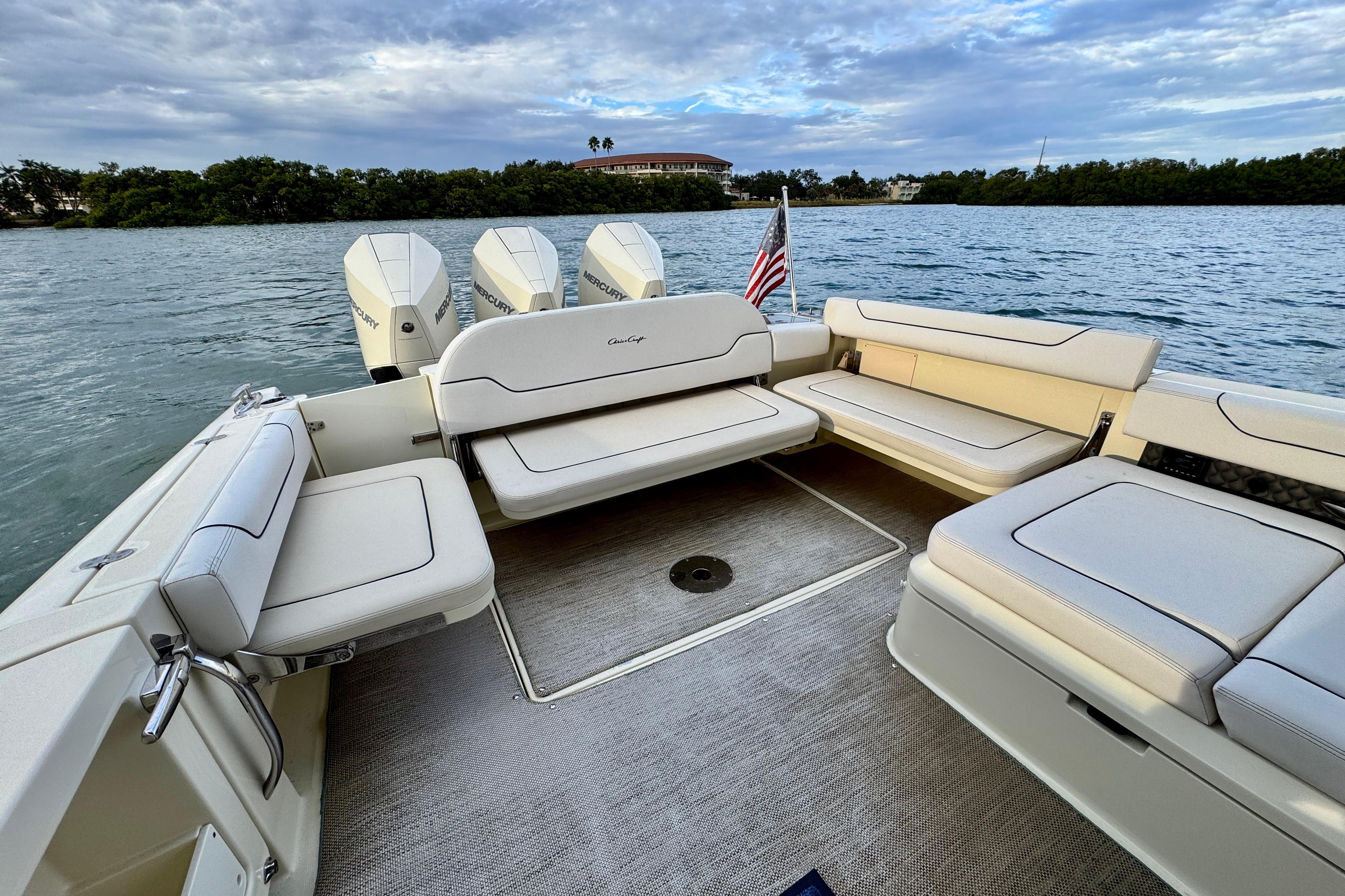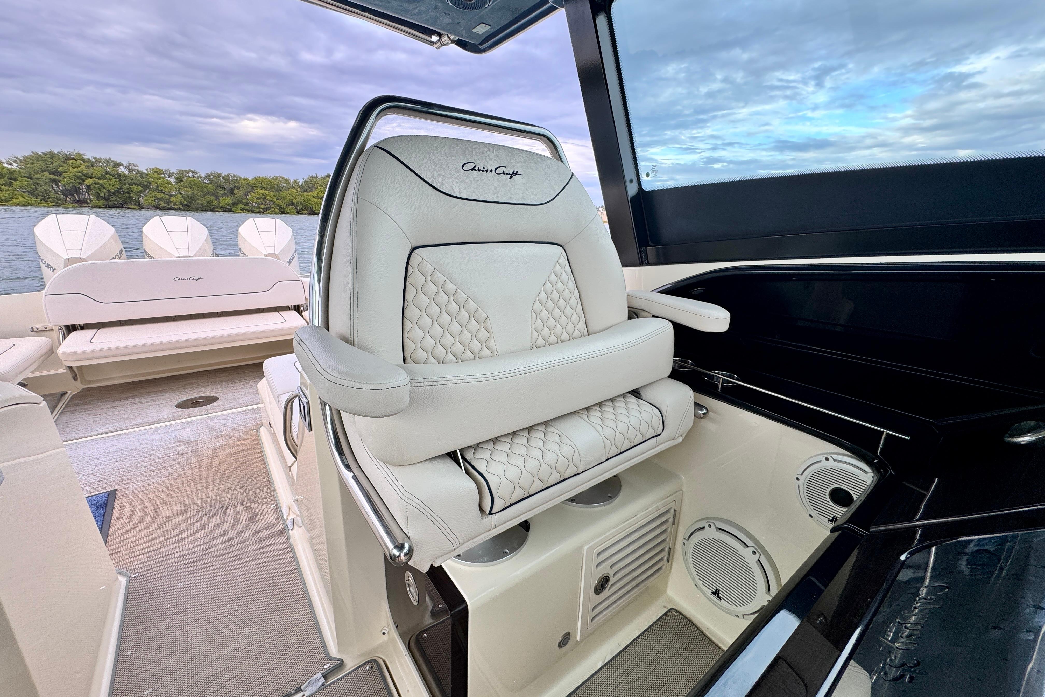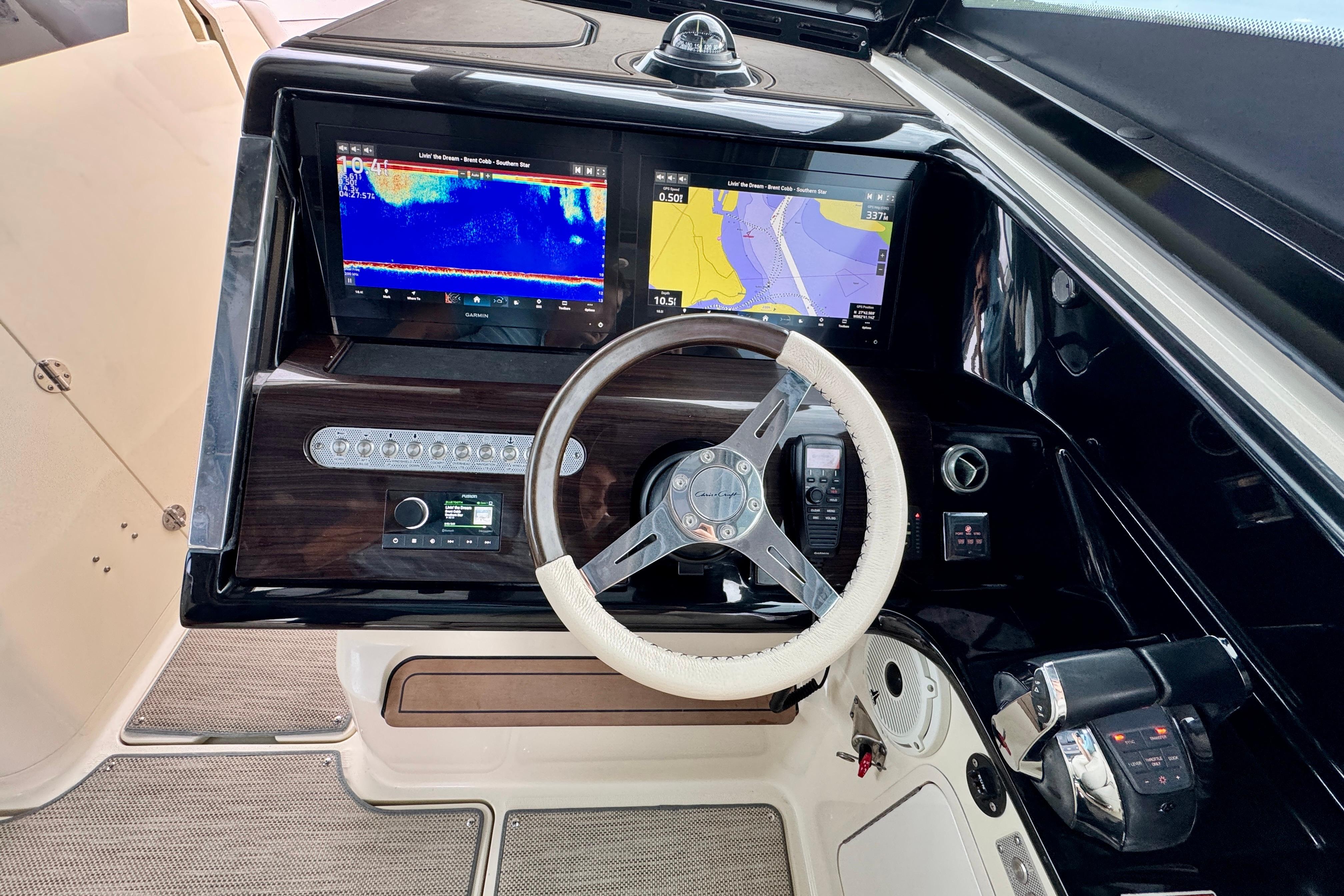 The Calypso 35 debuts our fully enclosed windshield with a power actuated center walk-through and sliding wind door. When the windshield opens, it encloses into the hard top, creating unobstructed views through both driver and passenger sides. With an optional helm air conditioning and heat system, the Calypso 35 offers maximum comfort for a great day on the water.