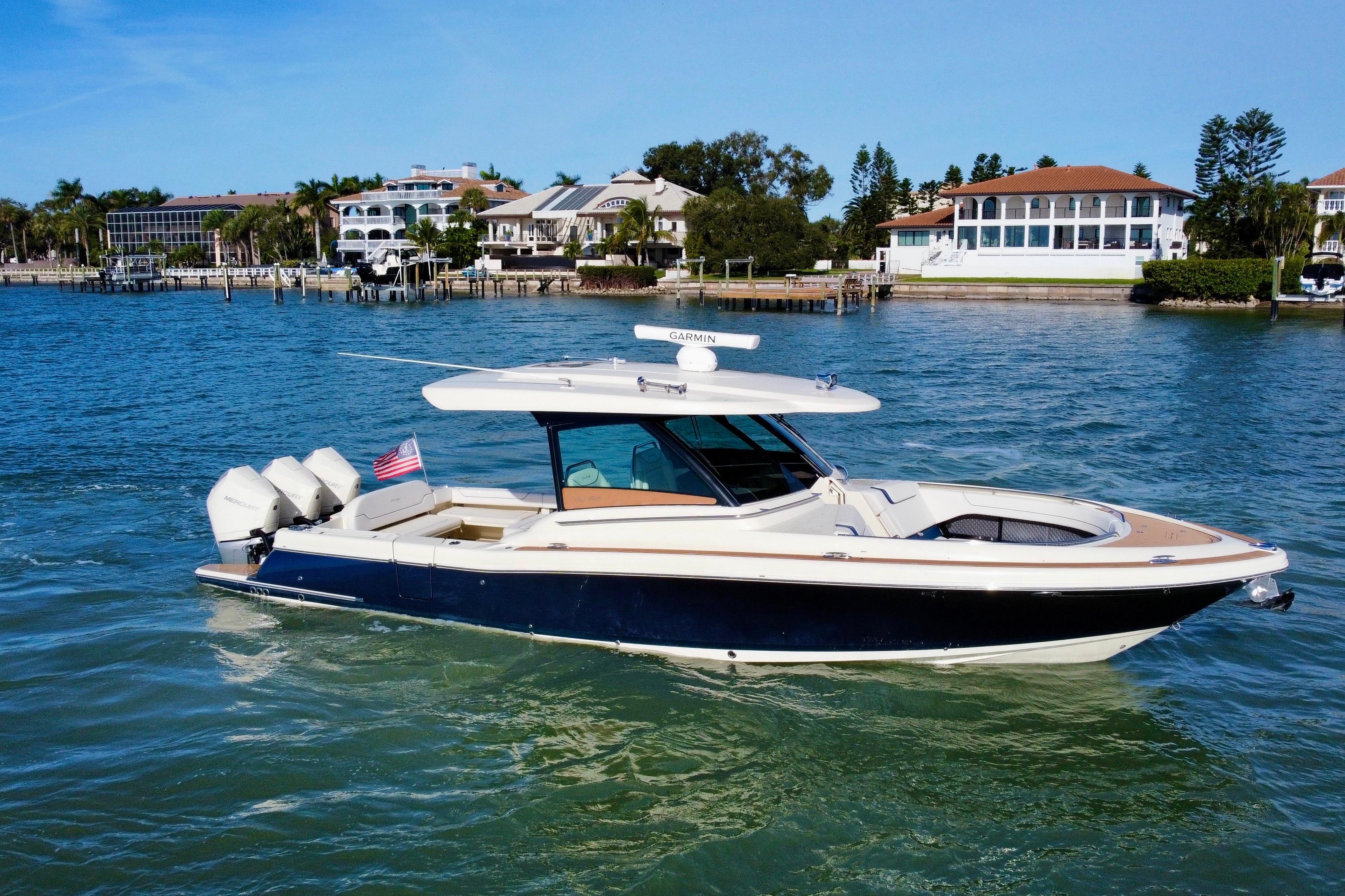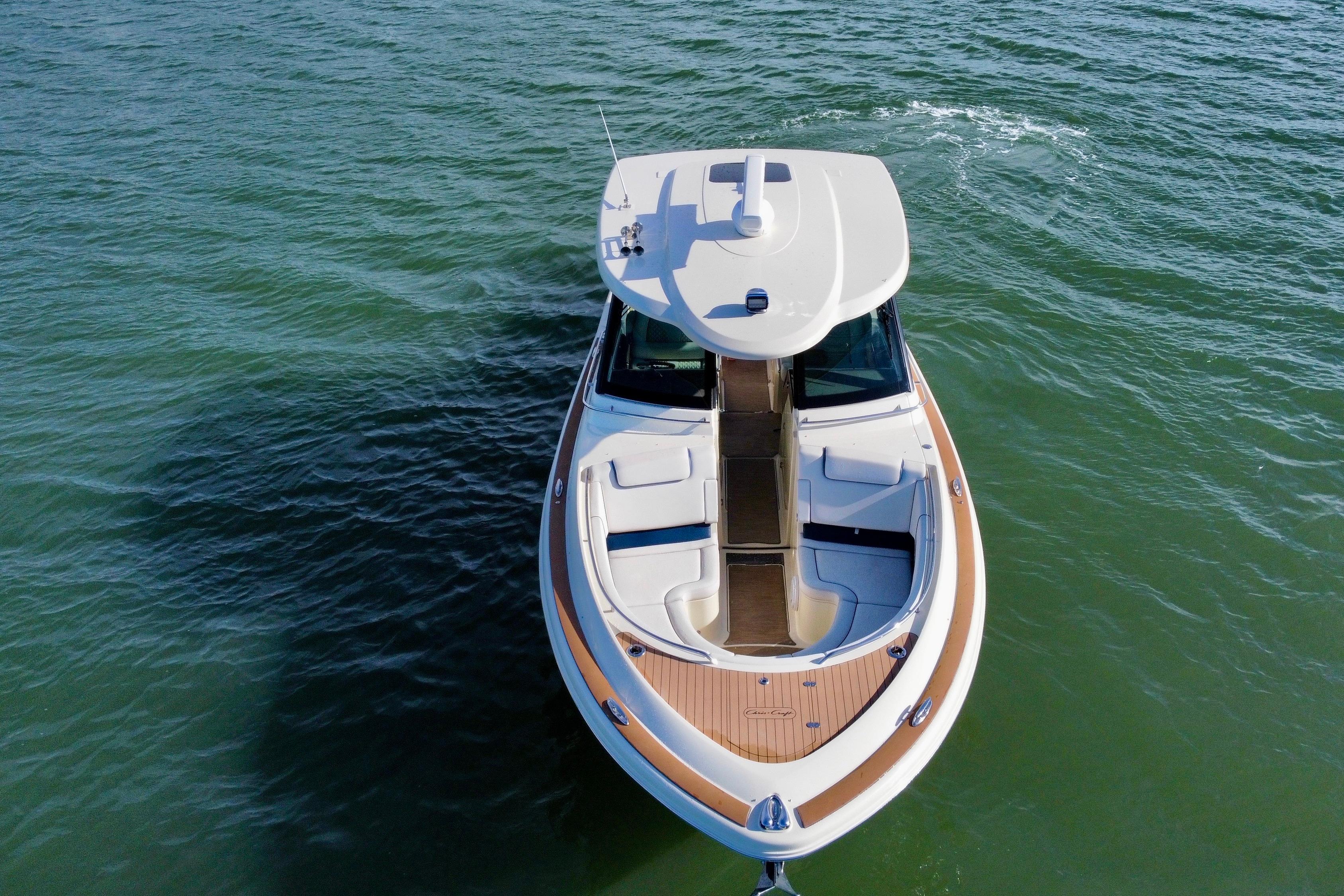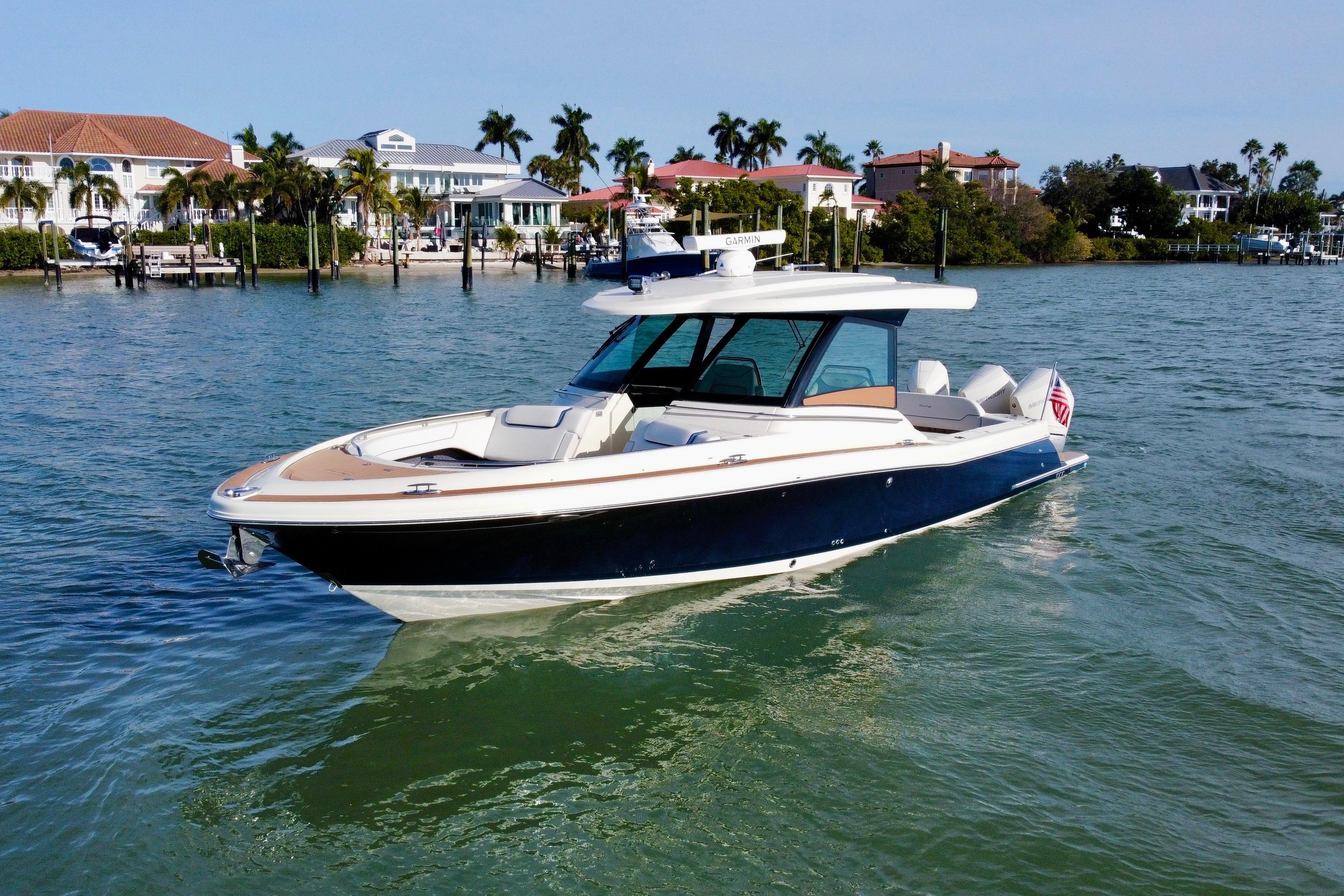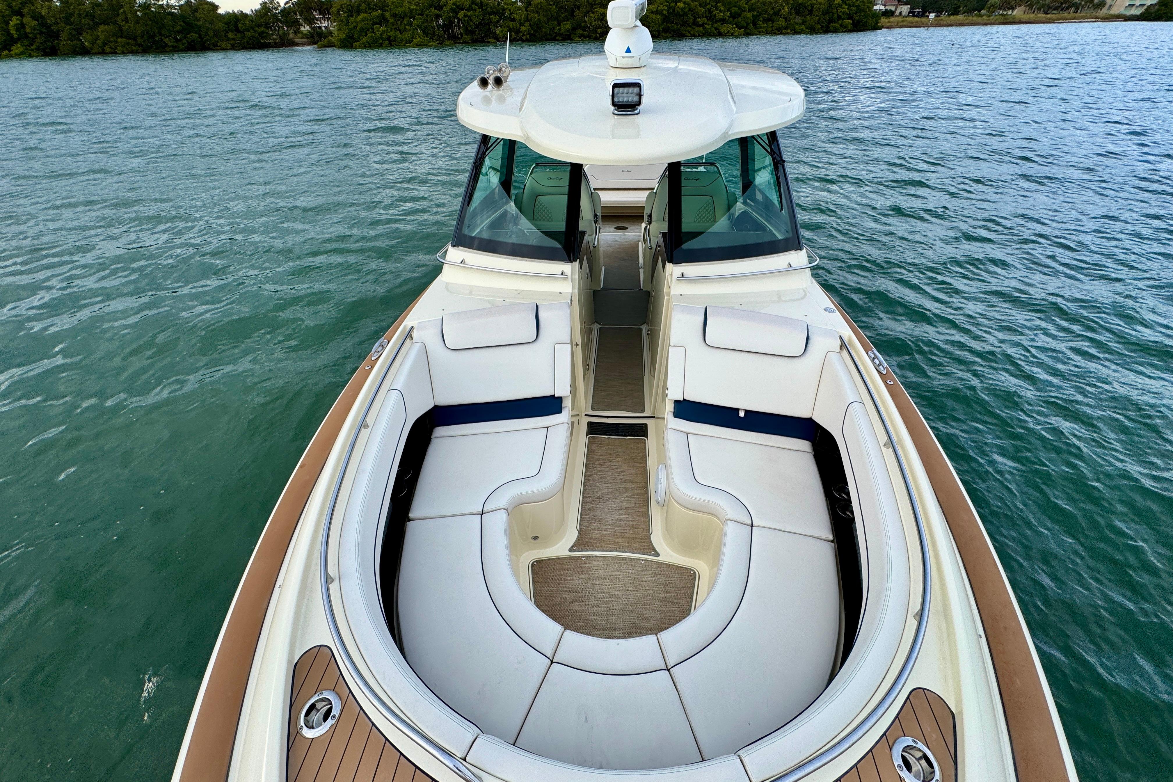 The Calypso 35 debuts our fully enclosed windshield with a power actuated center walk-through and sliding wind door. When the windshield opens, it encloses into the hard top, creating unobstructed views through both driver and passenger sides. With an optional helm air conditioning and heat system, the Calypso 35 offers maximum comfort for a great day on the water.