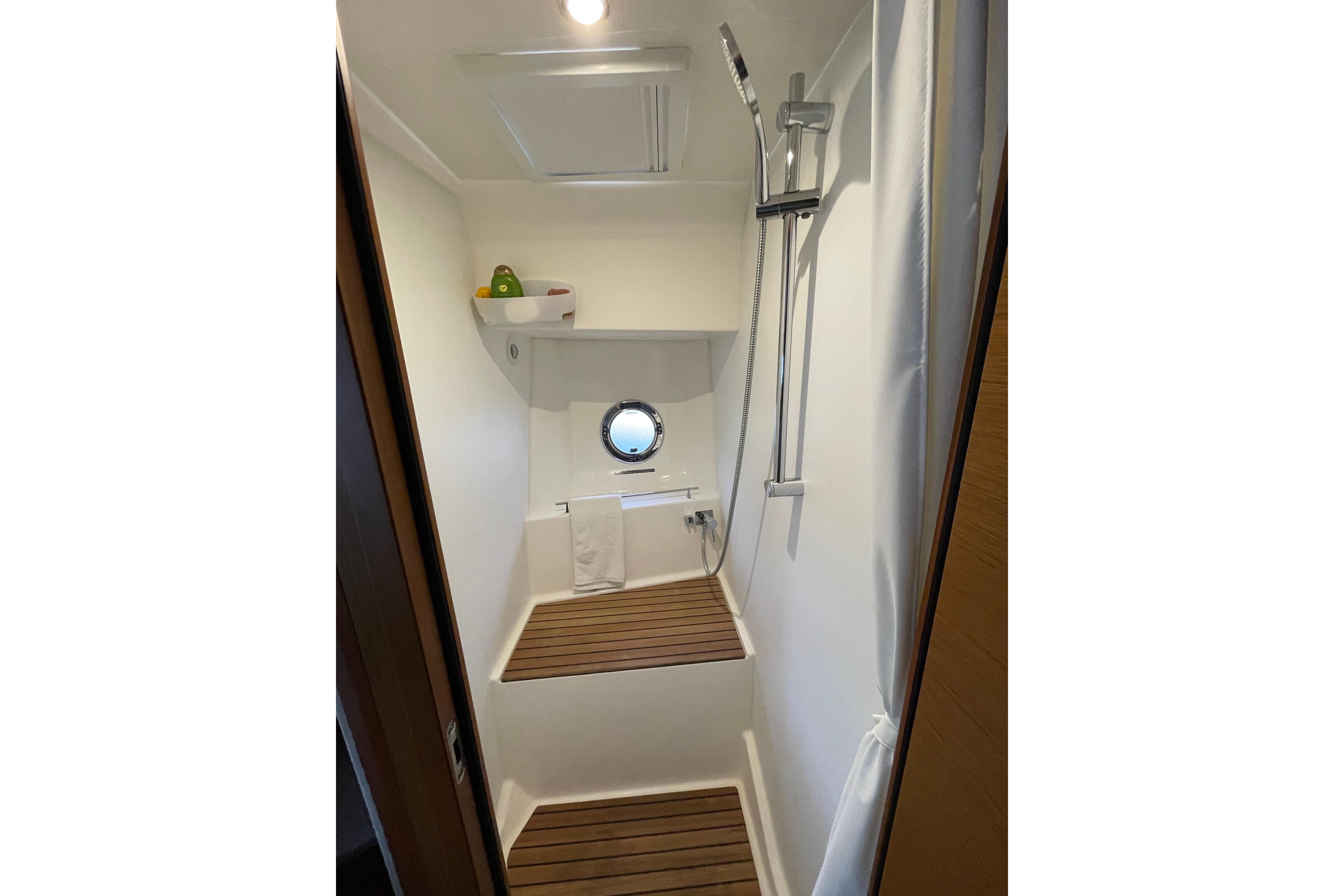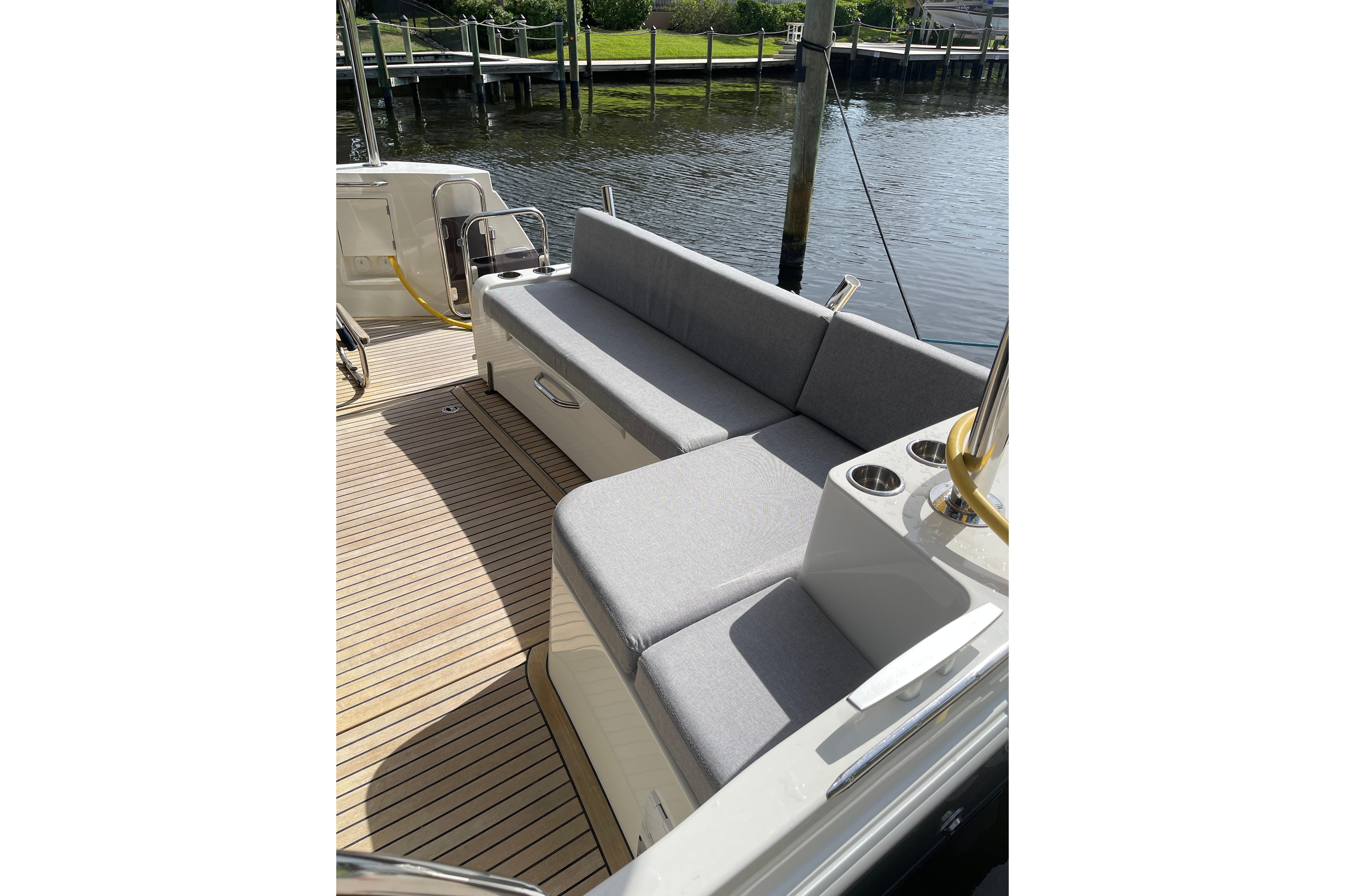 Elegant and sleek Pearl Grey hull finish, designed for optimal fuel efficiency and sea performance