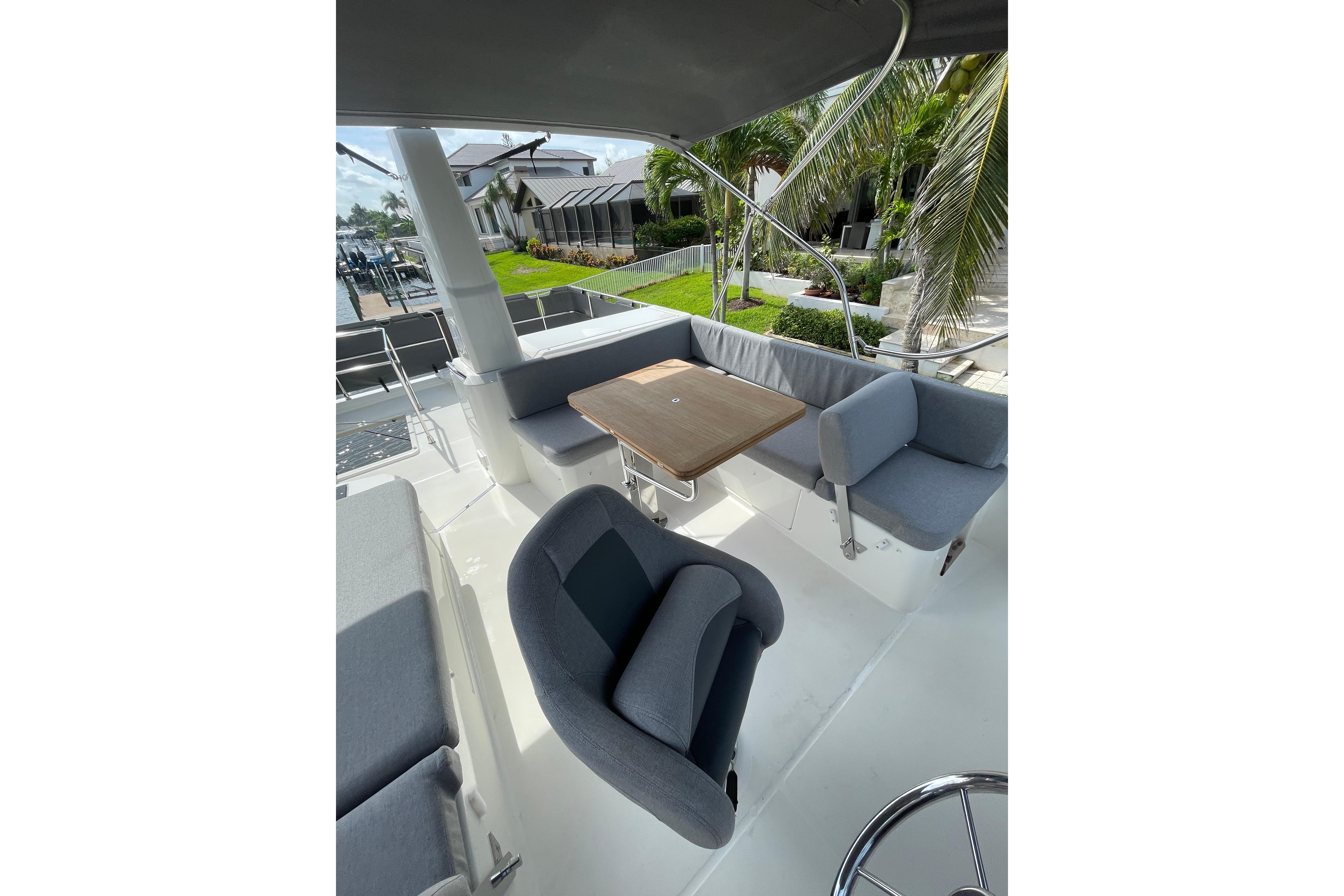 Aft galley opens to cockpit with a sliding bench and swim platform access